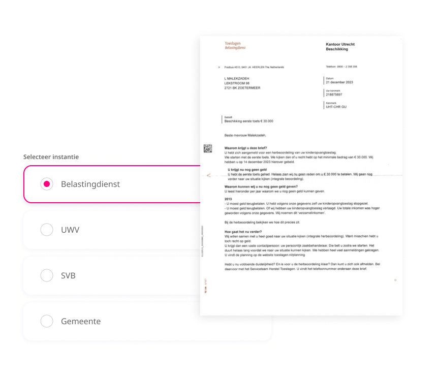 We voeren zowel procedures bij het UWV, als het gaat om jouw WIA, WW of ZW-uitkering, als procedures bij de gemeente over de bijstand. Heb je een probleem met de SVB, bijvoorbeeld over kinderbijslag? Ook dan helpen we je gratis. We zijn er ook voor de toeslagenouders. Ben je als toeslagenouder gedupeerd? Dan proberen wij € 30.000 schadevergoeding voor jou te regelen.